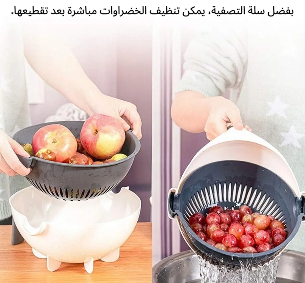 مزودة بسلة تصفية دوّارة تسمح لك بغسل الخضار والفواكه مباشرة بعد التقطيع بدون الحاجة لاستخدام أدوات إضافية.